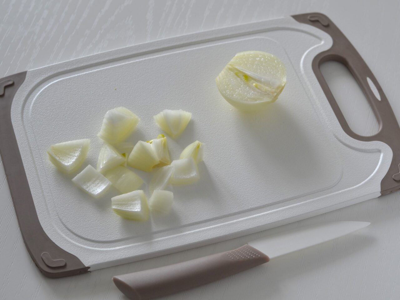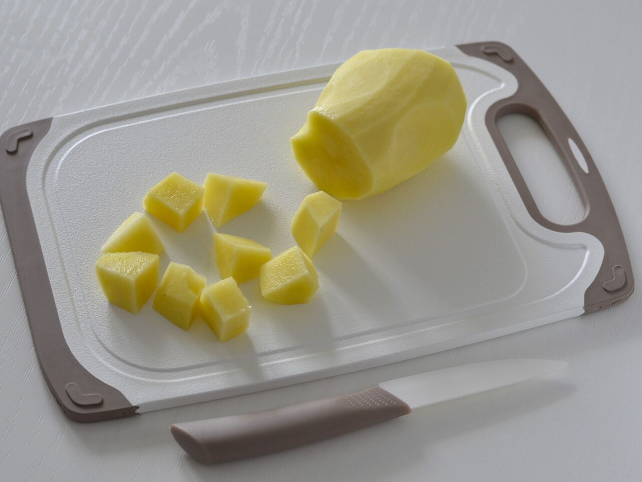 - Curatati cartofii de coaja si taiati-i in cuburi de marime medie.