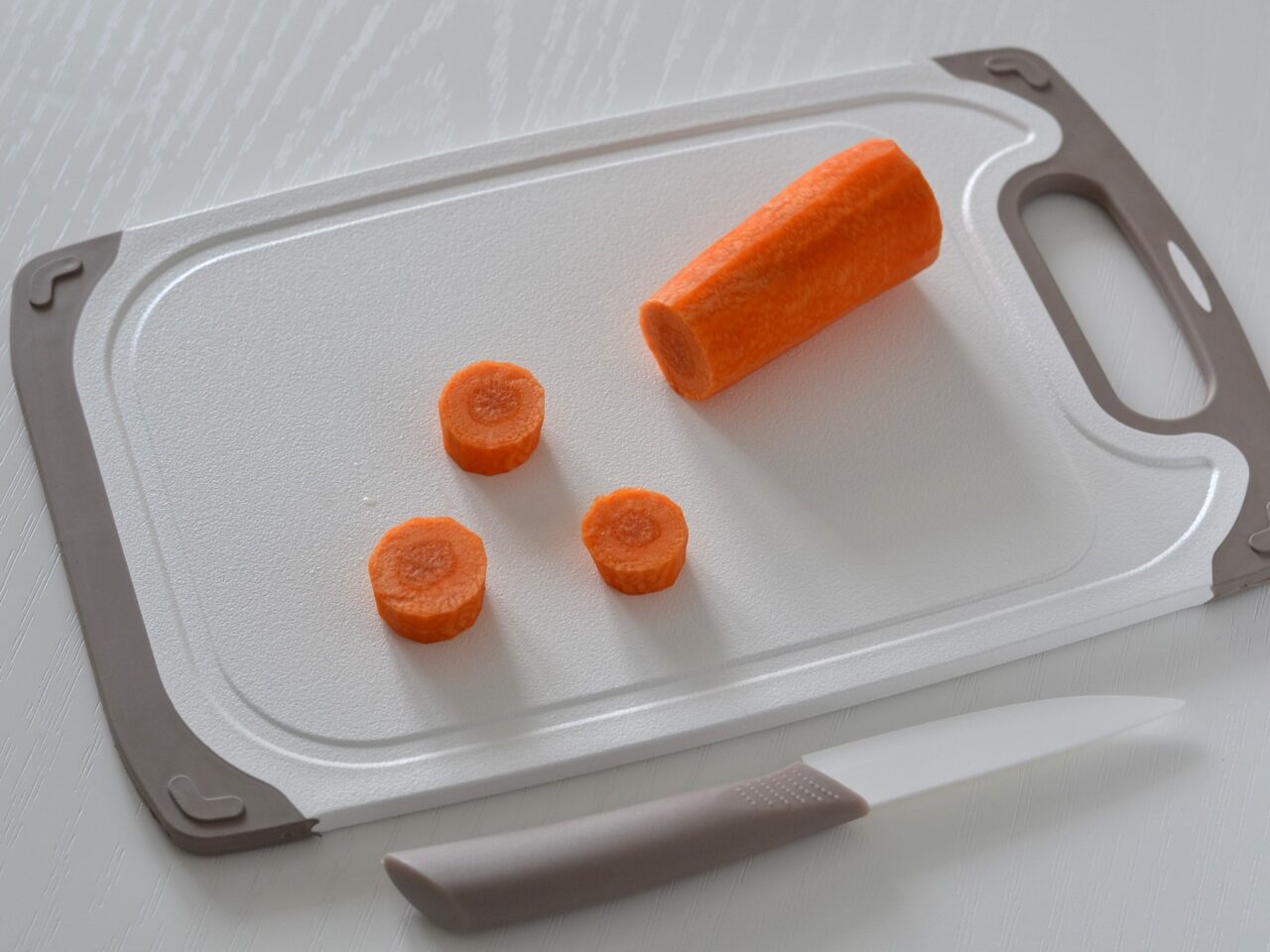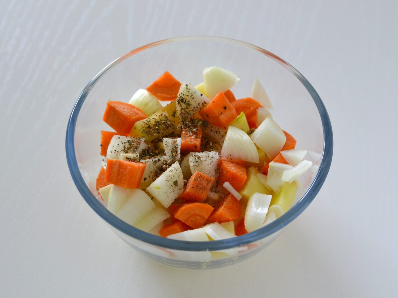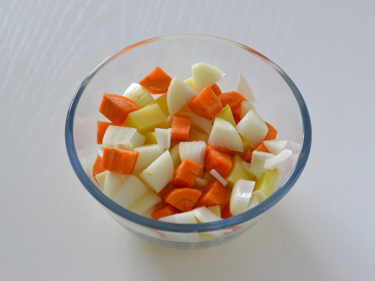 - Curatati morcovii de coaja si, de asemenea, taiati-i in cuburi sau cercuri mici.