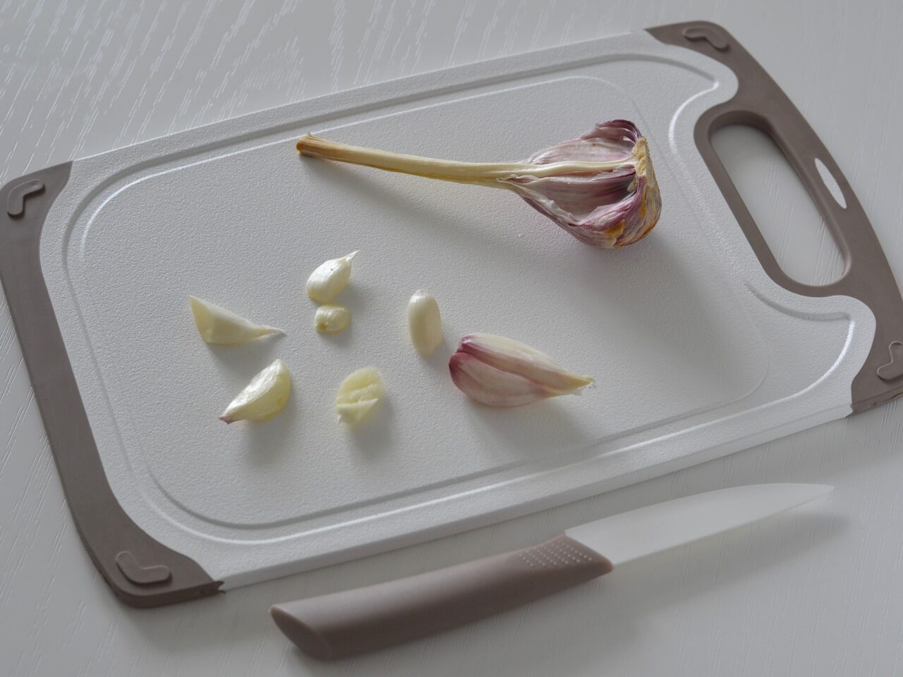 - Curatati usturoiul si taiati cateii de usturoi in mai multe bucati.