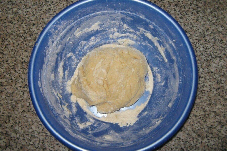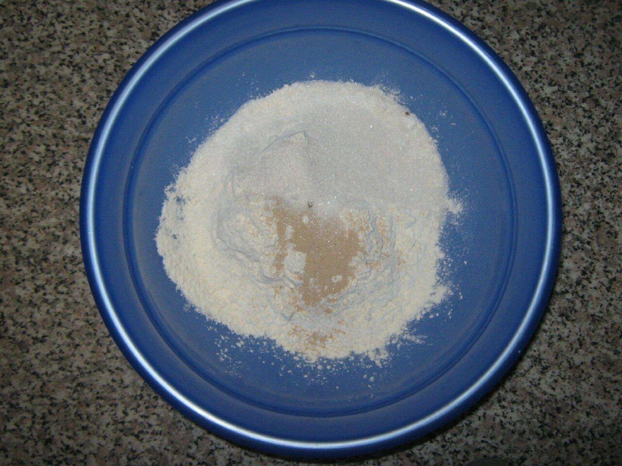 - Într-un recipient adânc, amestecați făina, zahărul, drojdia.