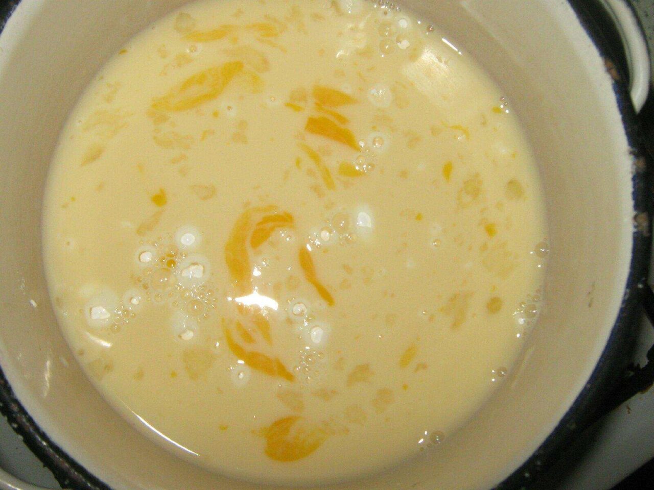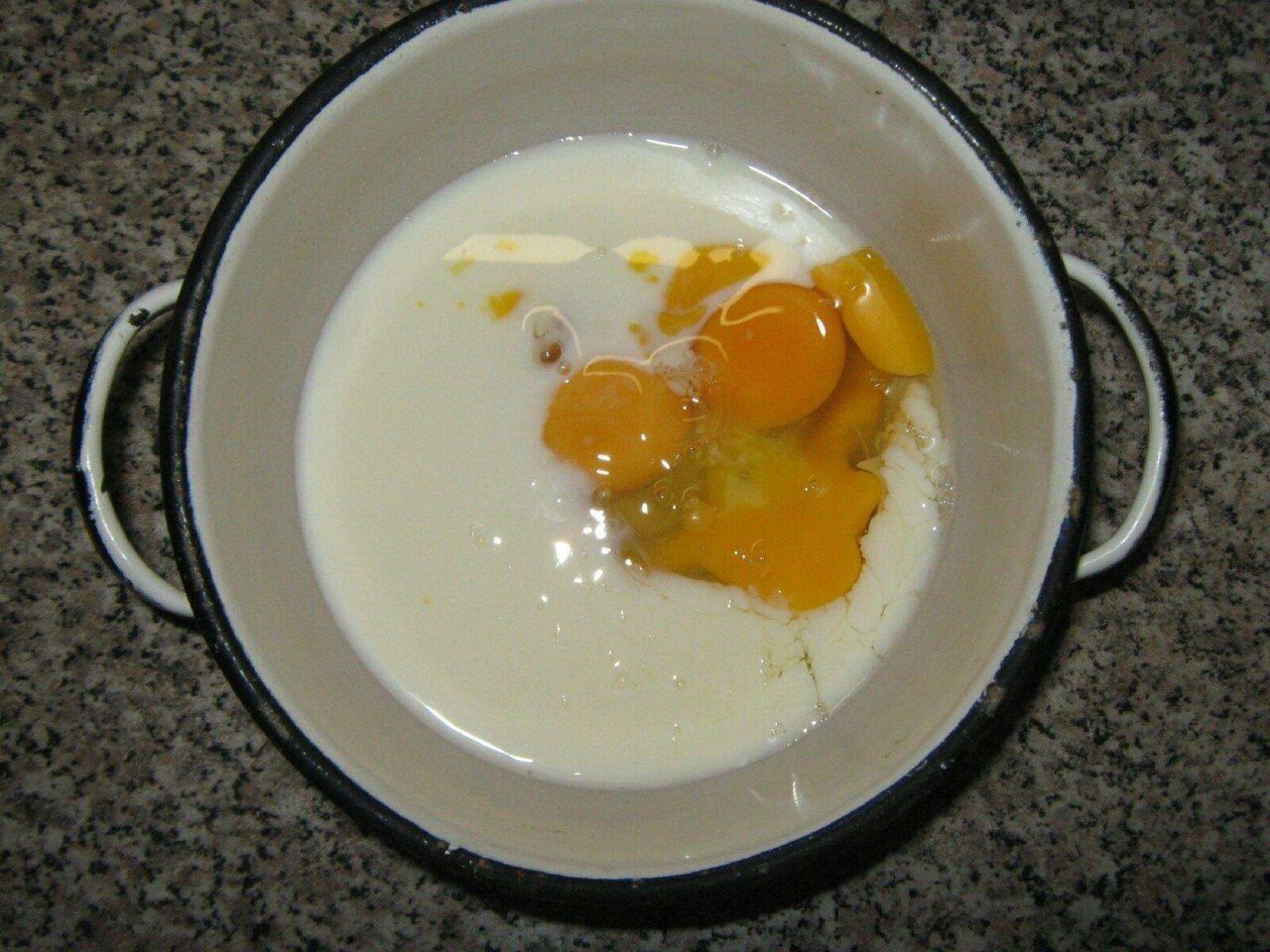 - In timp ce aluatul creste, sa pregatim crema. Amestecati ouăle și laptele într-o cratiță. Îl puneti pe foc.
