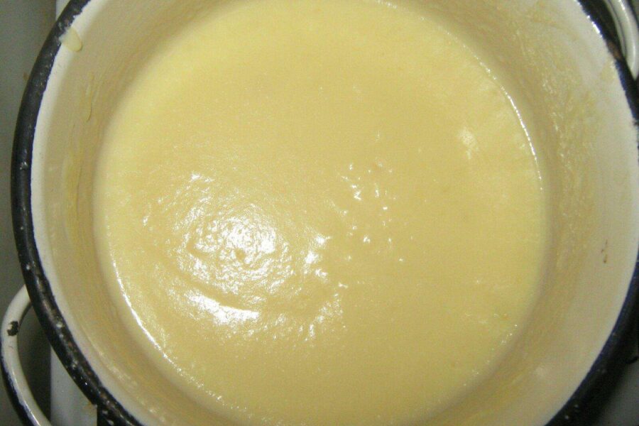 - Aduceți crema la fiert, apoi amestecați încă două minute, apoi luați crema de pe foc. Se lasa sa se raceasca la temperatura camerei.