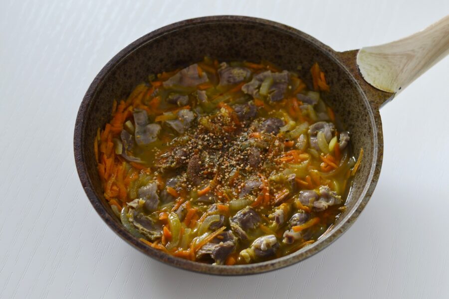 - Adaugati morcovii rasi in tigaie impreuna cu ceapa. Continuati sa gatiti timp de aproximativ trei minute.