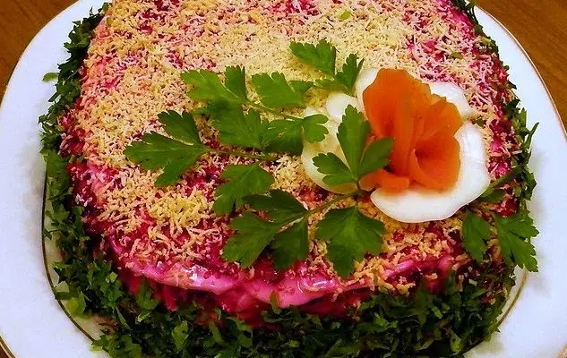 - Alternati straturile de mai multe ori, iese delicios, adică repetati straturile de salată de două ori exact în aceeași ordine, ungeti blatul cu maioneză, decorati cu ou sau brânză ras fin, un trandafir de sfeclă sau un morcov, floare și frunze proaspete de pătrunjel sau mărar.