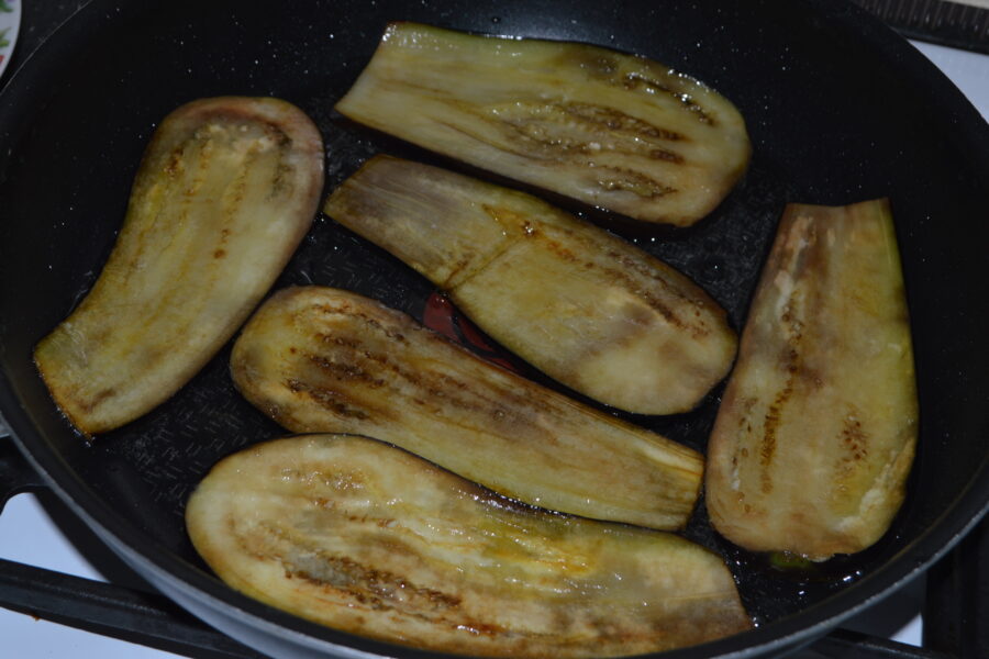 - Cu servetele uscate absorbati vinetele de apa. Apoi incingeti o tigaie cu ulei, si prajiti feliile de vinete, la foc mic, cu capac.