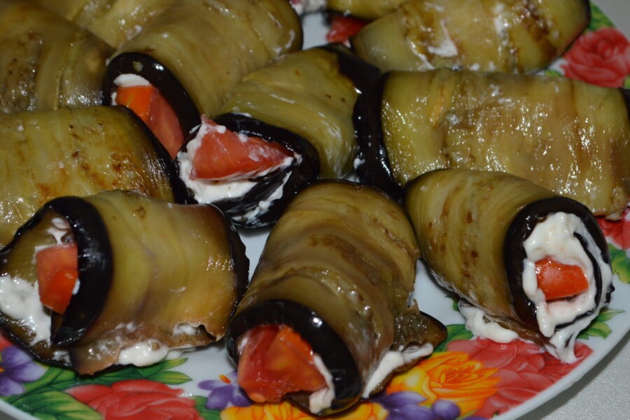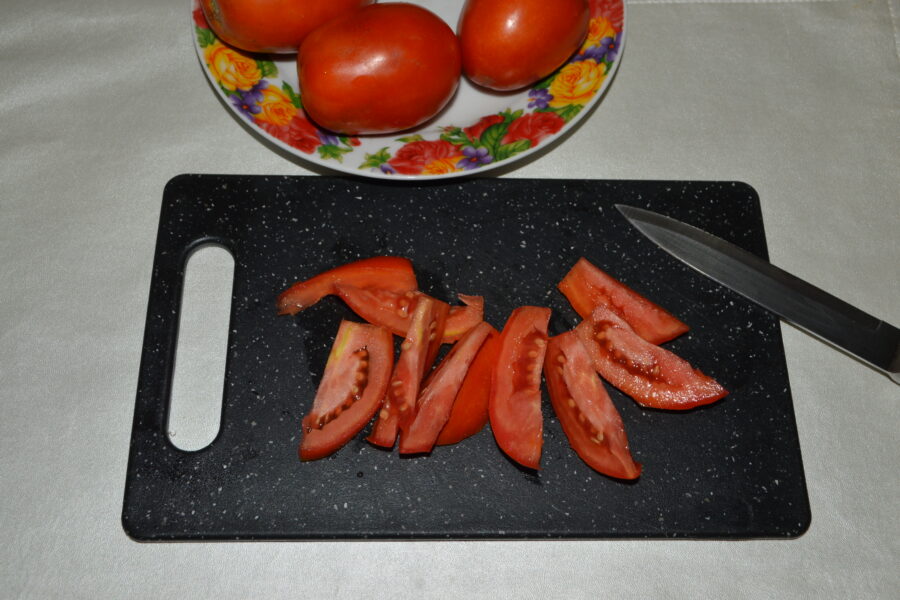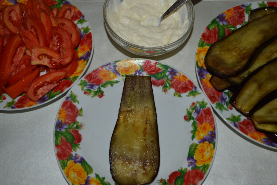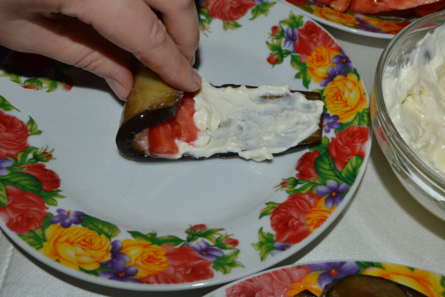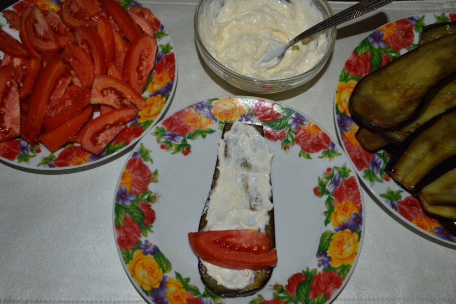 - Pregatiti masa de lucru: vinetele prajite, rosiile taiate, sosul de maioneza, iar intr-o farfurie puneti o felie de vanata.