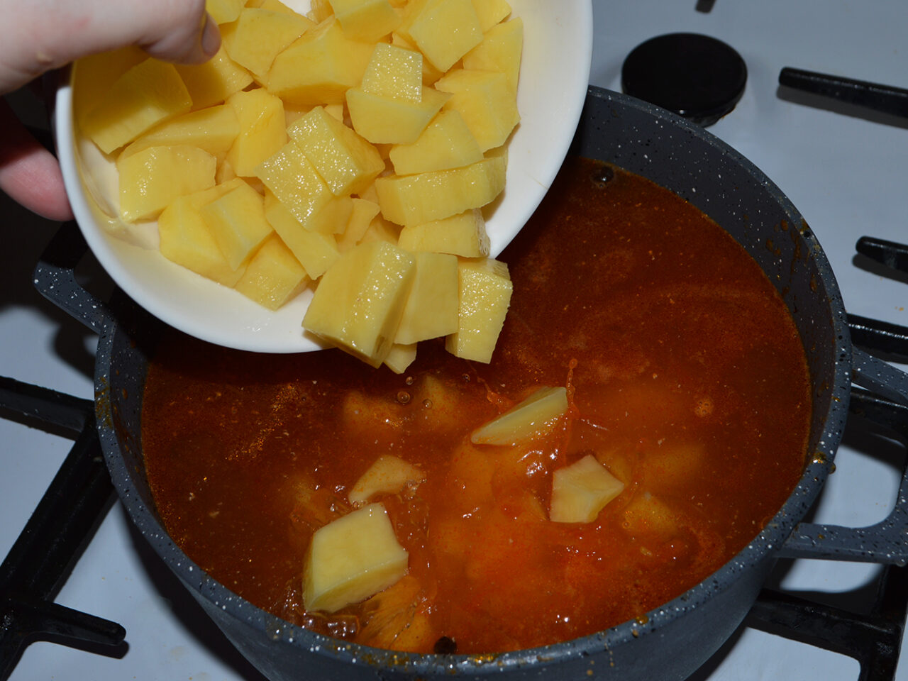 - Apoi adaugati cartofii taiati. Dati focul cat mai mare sa inceapa a fierbe apa, apoi reduceti focul la mediu si gatiti mancarea timp de 35-40 de minute.