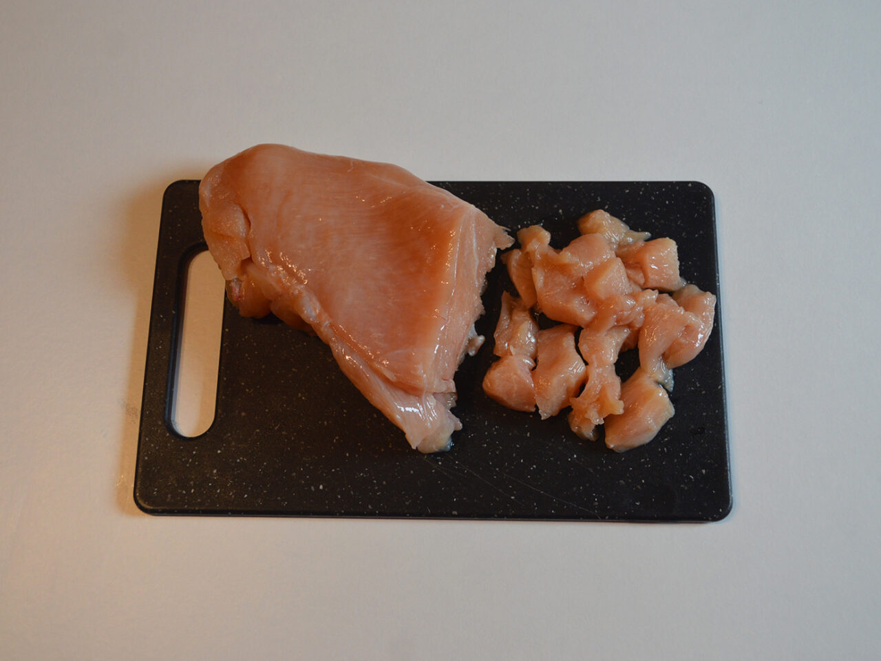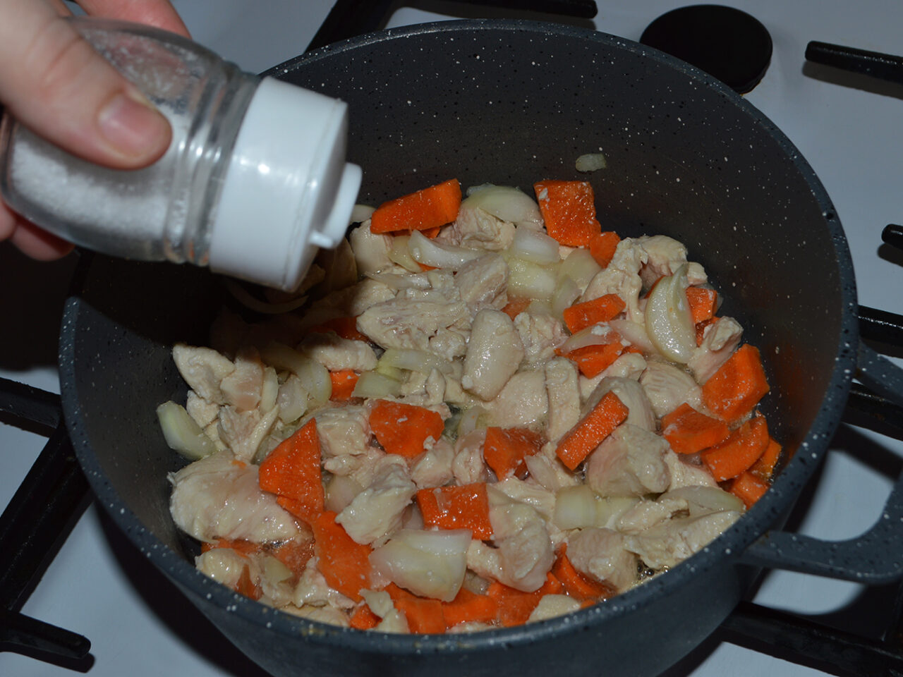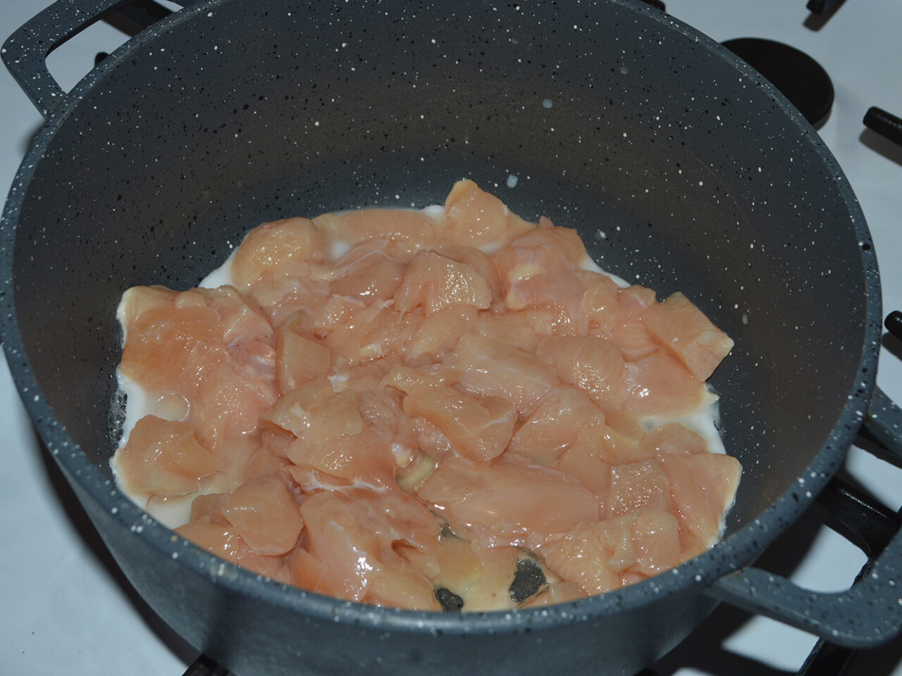 - Porniti focul si incingeti ceaunul cu putin ulei, apoi adaugati pieptul de pui taiat.