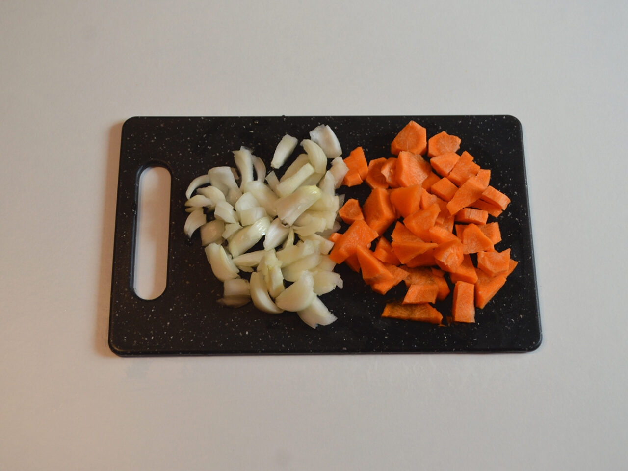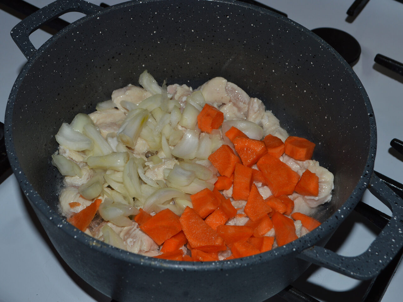 - Dupa un minut, adaugati ceapa si morcovul in ceaun. Dati focul mic.