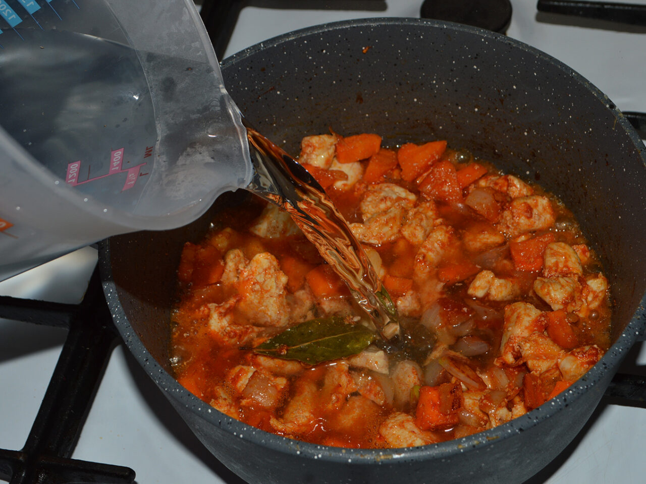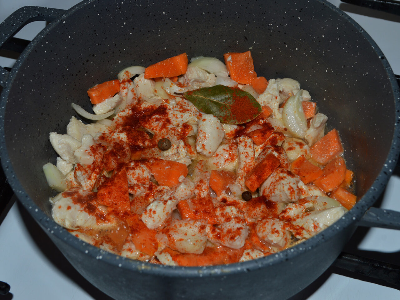 - Adaugati frunza de dafin, boabele de piper aromate si boia de ardei. Sotati timp de cateva minute.