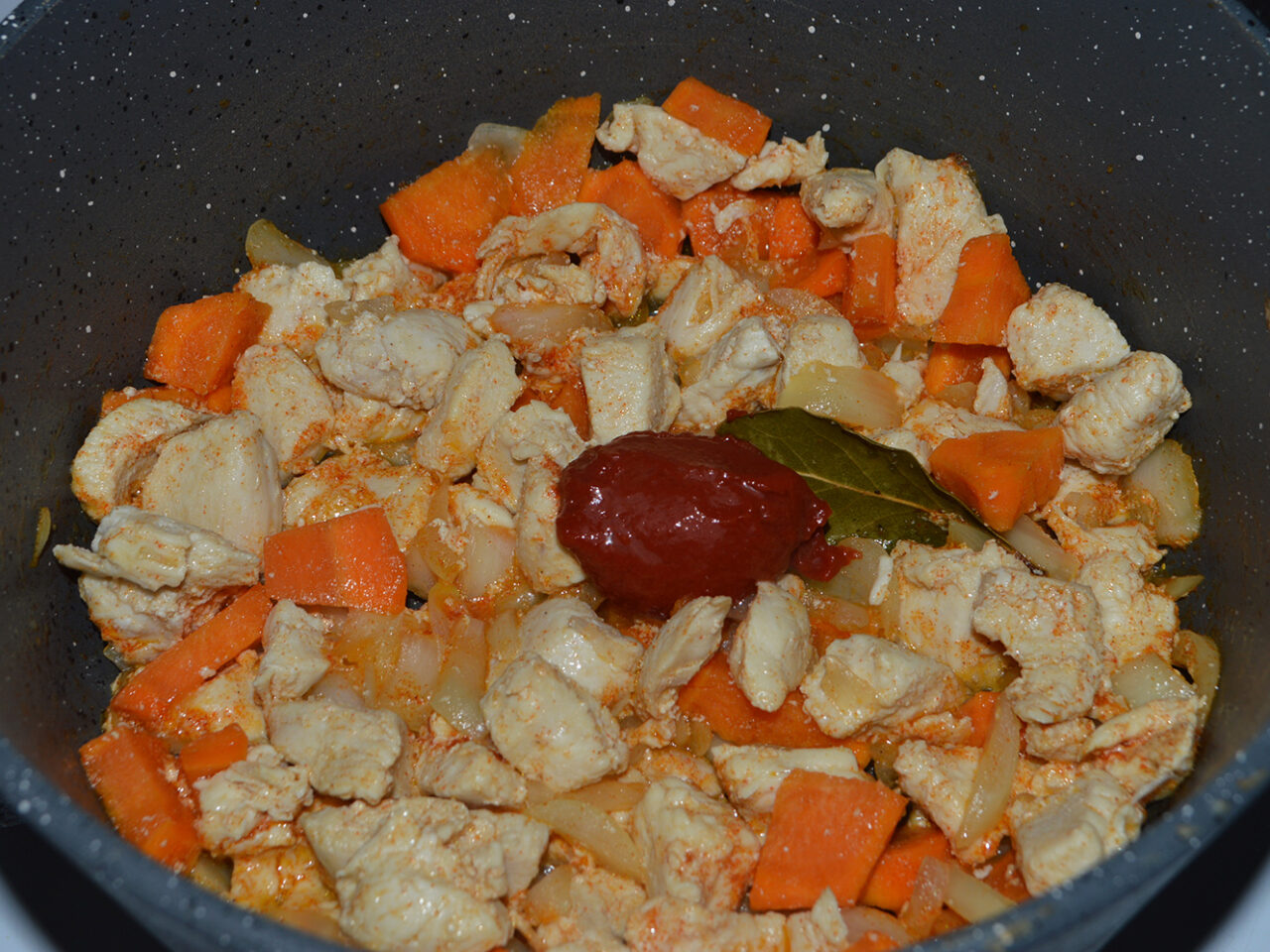 - Apoi adaugati o lingurita de pasta de tomate. Amestecati si mai sotati inca cateva minute.