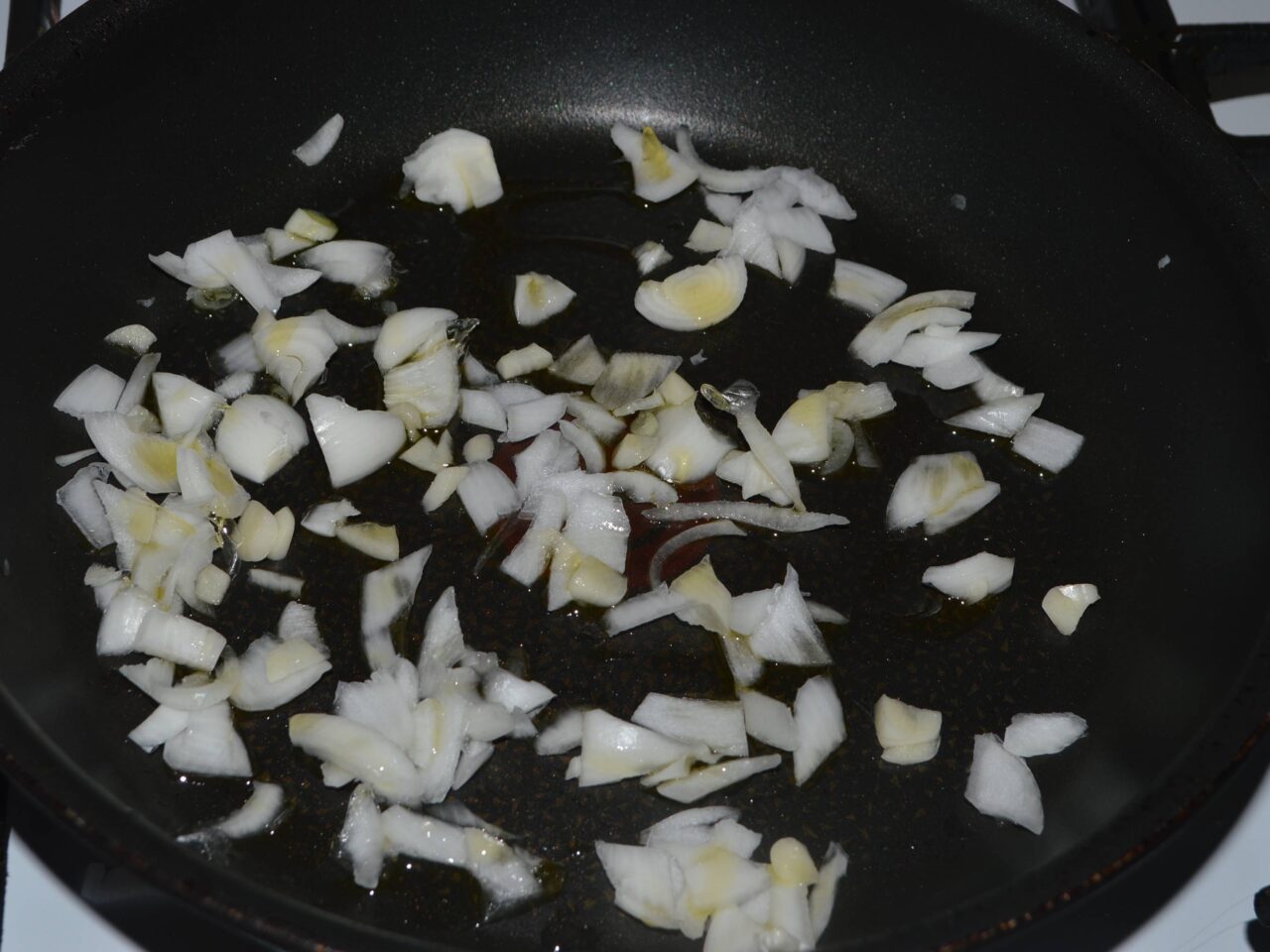 - Intr-o tigaie adaugati ceapa si usturoiul taiat, si turnati ulei de masline sau oricare alt ulei.