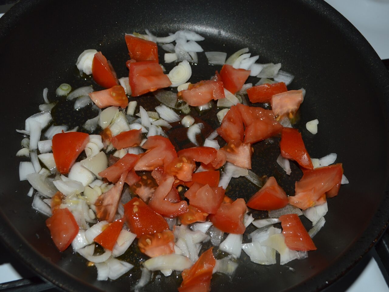 - Taiati rosia si adaugati-o in tigaie. Prajiti legumele cateva minute la foc mic.