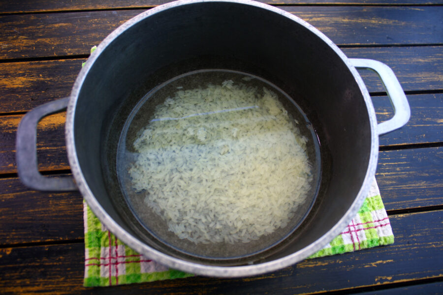 - Se clătește orezul și se toarnă 100 ml de apă peste el.