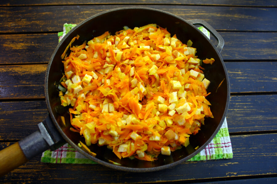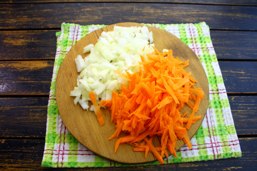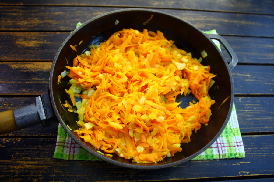 - Prăjiți ceapa și morcovii într-o tigaie cu ulei (încins) până când devin aurii.