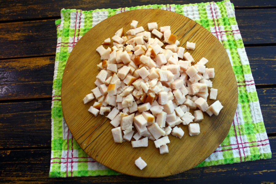 - Șunca se taie în cubulețe.