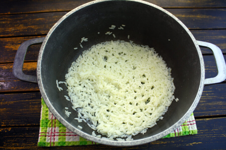 - Se fierbe orezul până când este pe jumătate fiert și lichidul este absorbit.