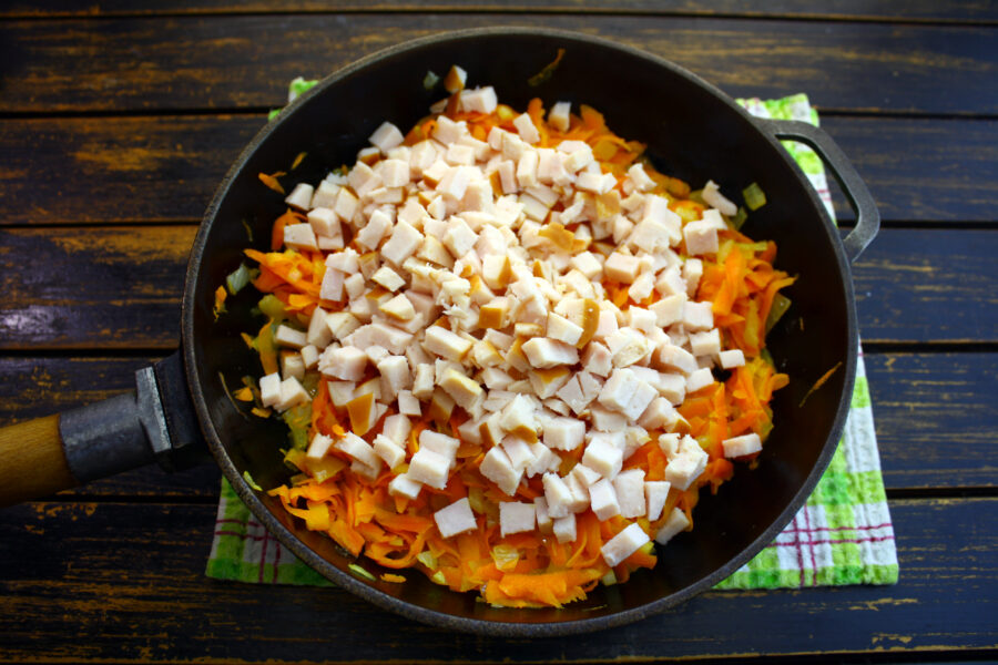 - Adăugați șunca în tigaie la ceapă și morcovi.