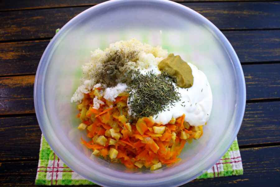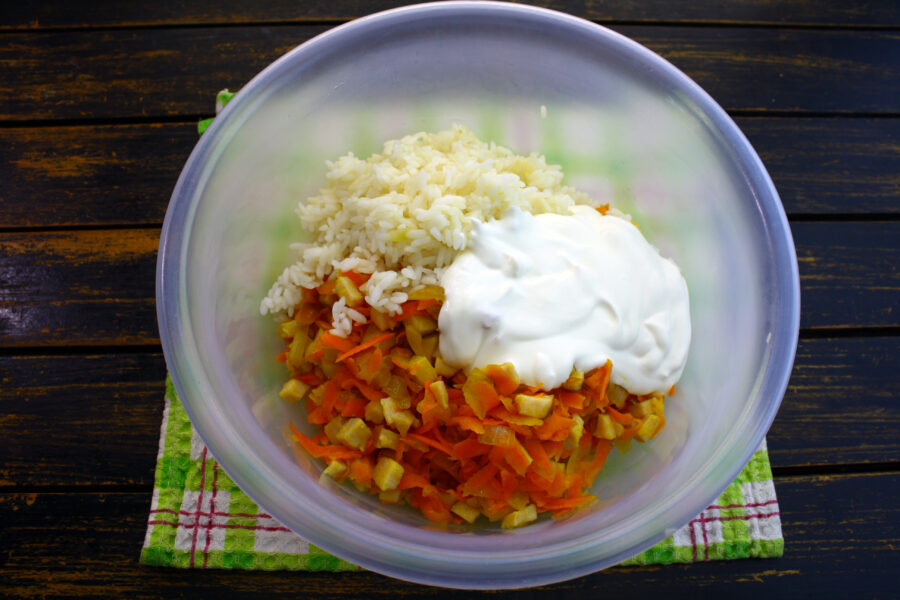 - Într-un recipient se amestecă morcovii, ceapa, smântâna și orezul.