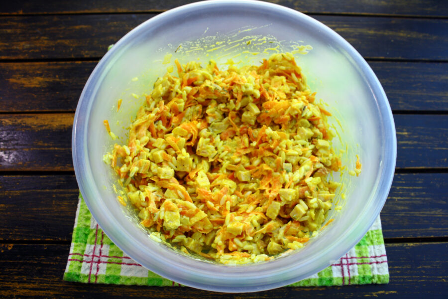 - Morcovii (curățați de coajă) se rad grosier, iar ceapa (curățată de coajă) se taie cubulețe.