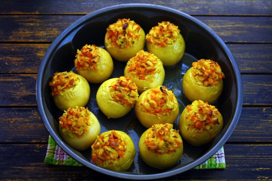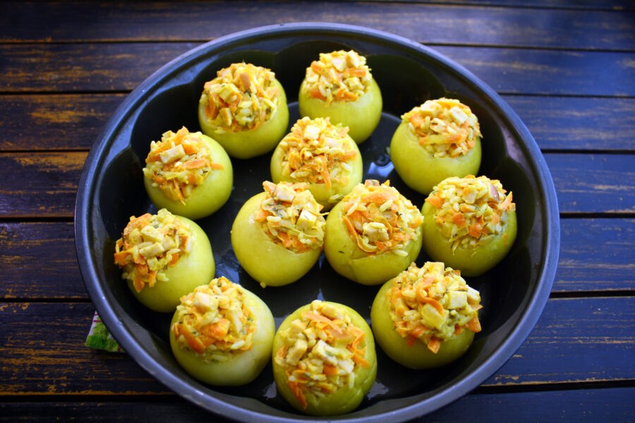 - Se umplu merele cu umplutura și se pun într-o formă de copt unsă cu ulei.