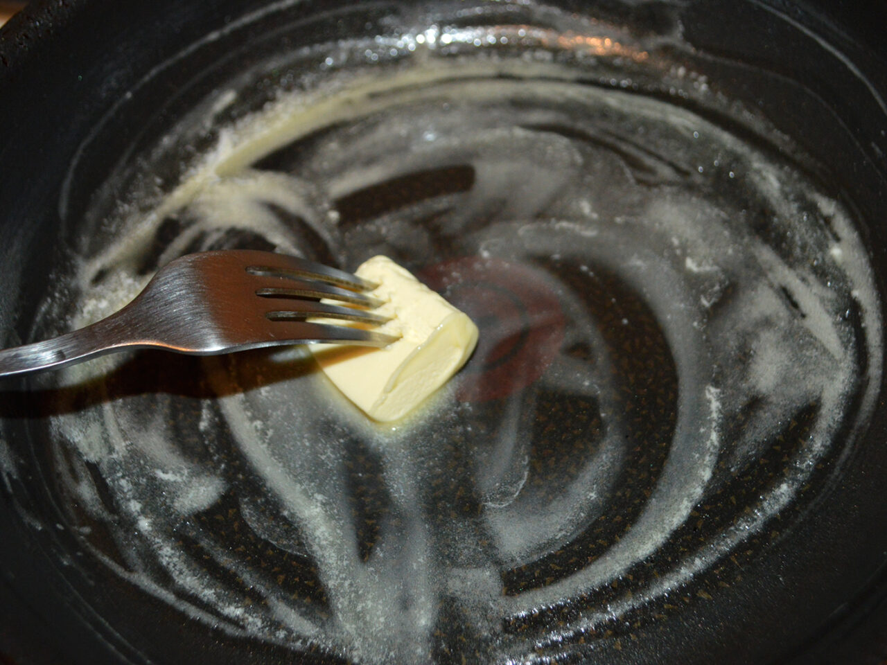 - Porniti aragazul si incingeti o bucata de unt intr-o tigaie.