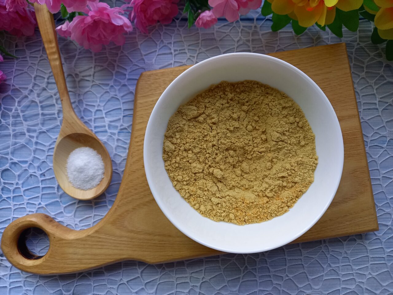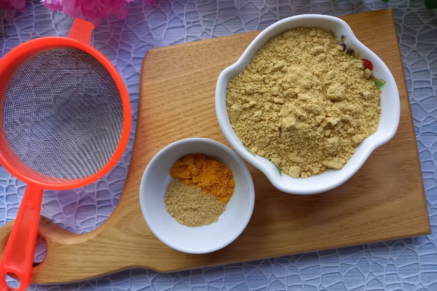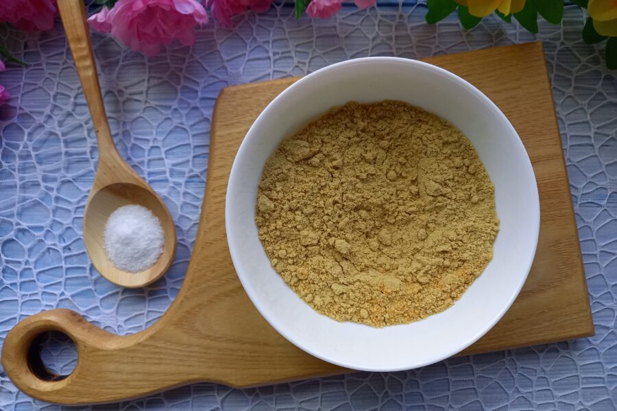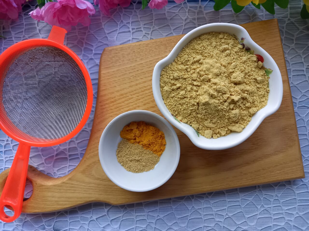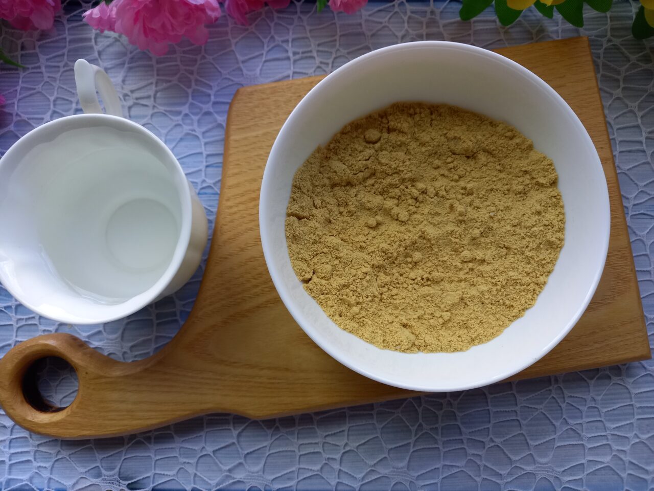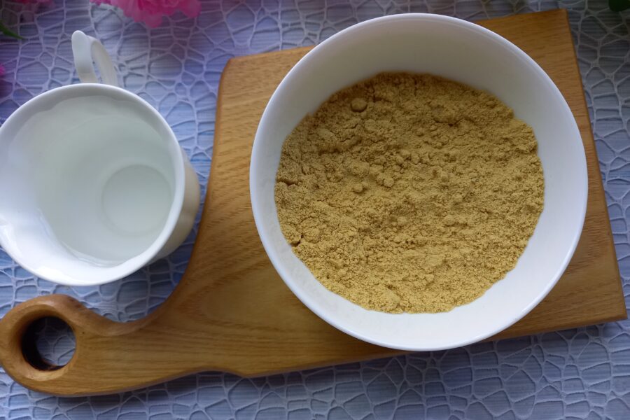 - Intr-un castron mic, cerneti pudra de mustar cu turmericul si ghimbirul (asta pentru a indeparta eventualele resturi si pentru a sparge eventualele cocoloase).