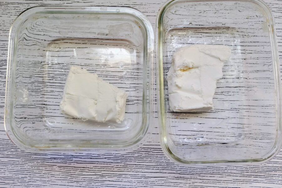 - Omleta se poate prepara atat intr-o singura forma, cat si in doua forme portionate, eu insa am ales a face doua portii. Ungeti forma de copt cu unt si puneti branza, impartind-o in doua portii egale.