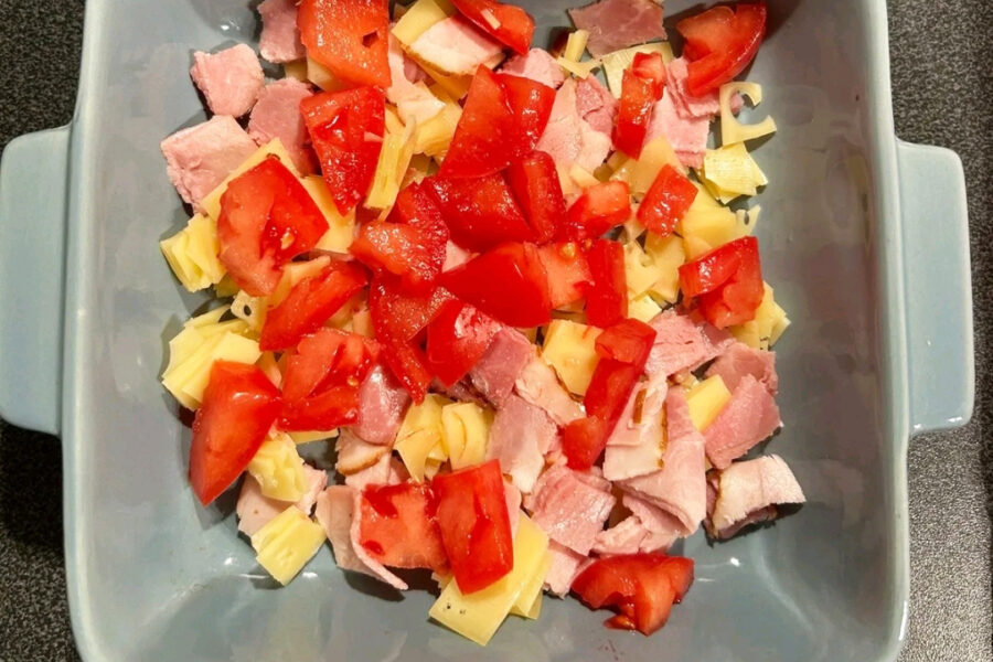 - Taiati rosia, sunca si cascavalul in bucati mici.