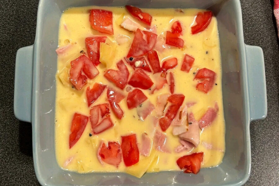 Reteta de omleta la cuptor cu sunca, cascaval si rosii, este foarte gustoasa si se potriveste perfect pentru micul dejun. Este o varianta mai sanatoasa a omletei, pentru ca nu se foloseste deloc ulei, nu se prajeste ci se coace.