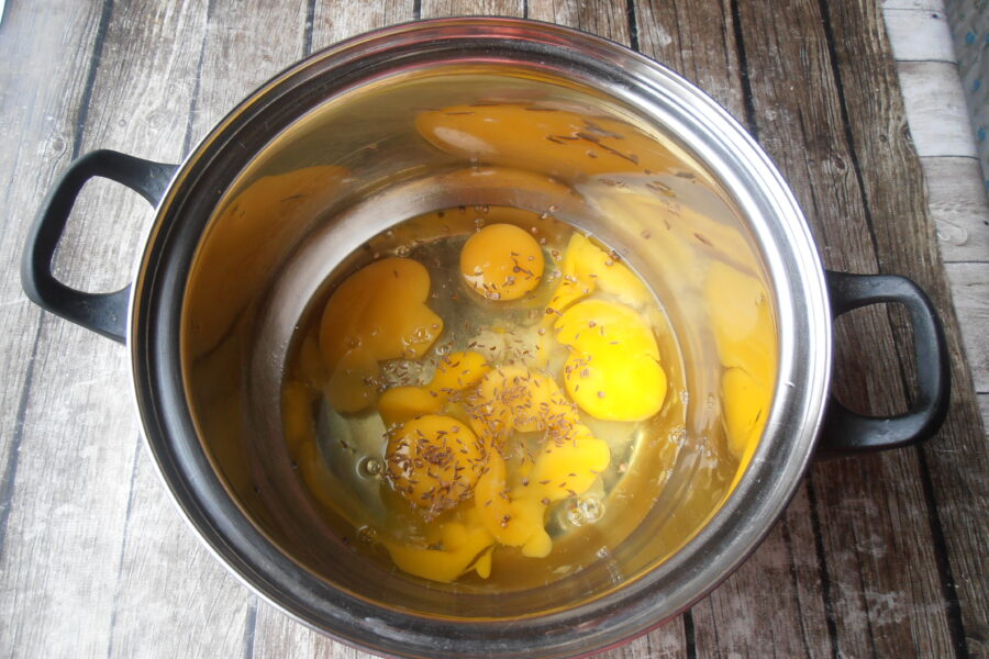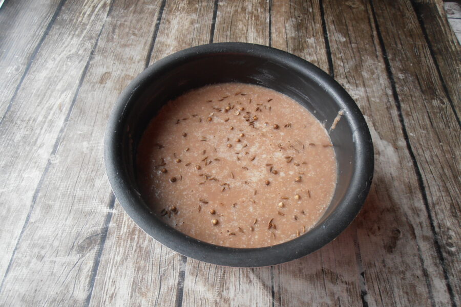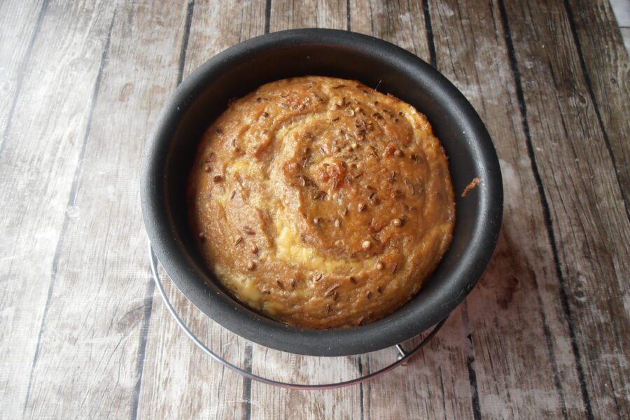 - Se unge vasul de copt cu ulei, se toarnă aluatul, se decorează deasupra cu semințe de chimen și semințe de coriandru. Coaceți pâinea timp de 40 de minute. Apoi reduceți temperatura cuptorului la 175 grade Celsius. Coaceți timp de 20 de minute. Verificați cu o țepușă de lemn pentru a vedea dacă pâinea este gata.