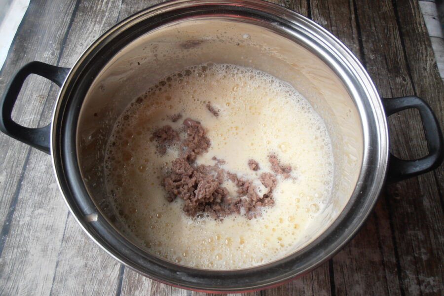 - Adăugați carnea de vită în ouă. Se bate amestecul până se obține un aluat neted, fără cocoloașe.