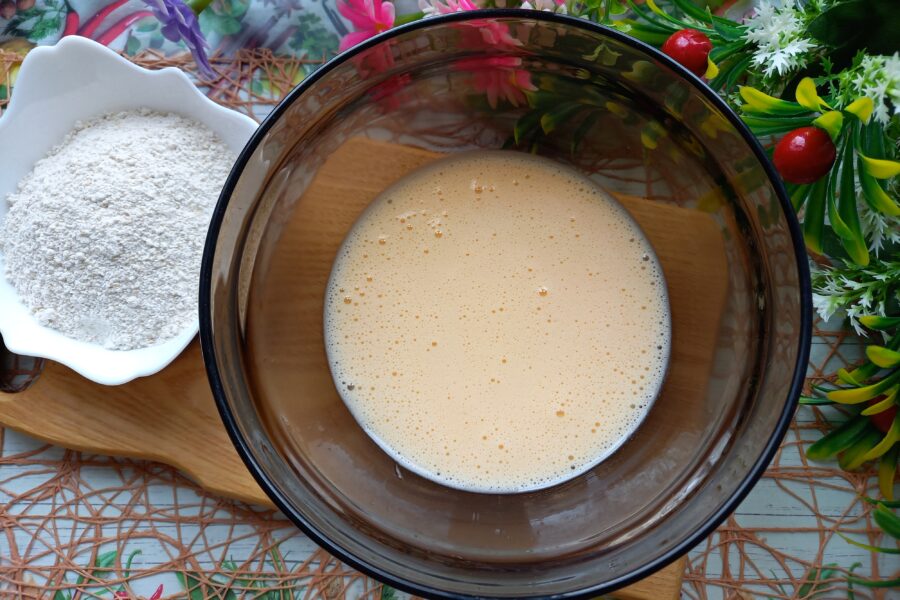 - Apoi, cerneti faina de ovaz si o turnati treptat in compozitie. Amestecati. Ca rezultat vom obtine un aluat vascos nu foarte gros de pandispan.