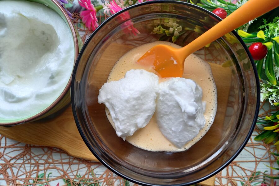 - Treptat introduceti spuma de proteine in amestecul dulce de galbenusuri.