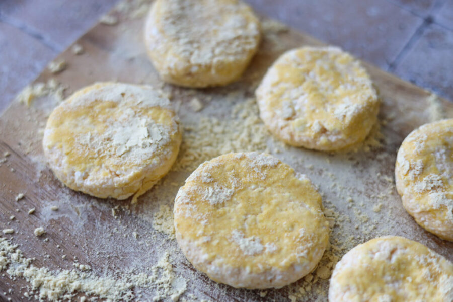 - Se presară cu restul de făină de porumb și apoi se formează papanasii cu brânză, presărând pe ambele părți. Pentru a obține margini uniforme, fiecare papanas poate fi acoperit cu un pahar și apoi rulat de mai multe ori.