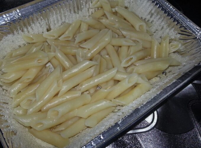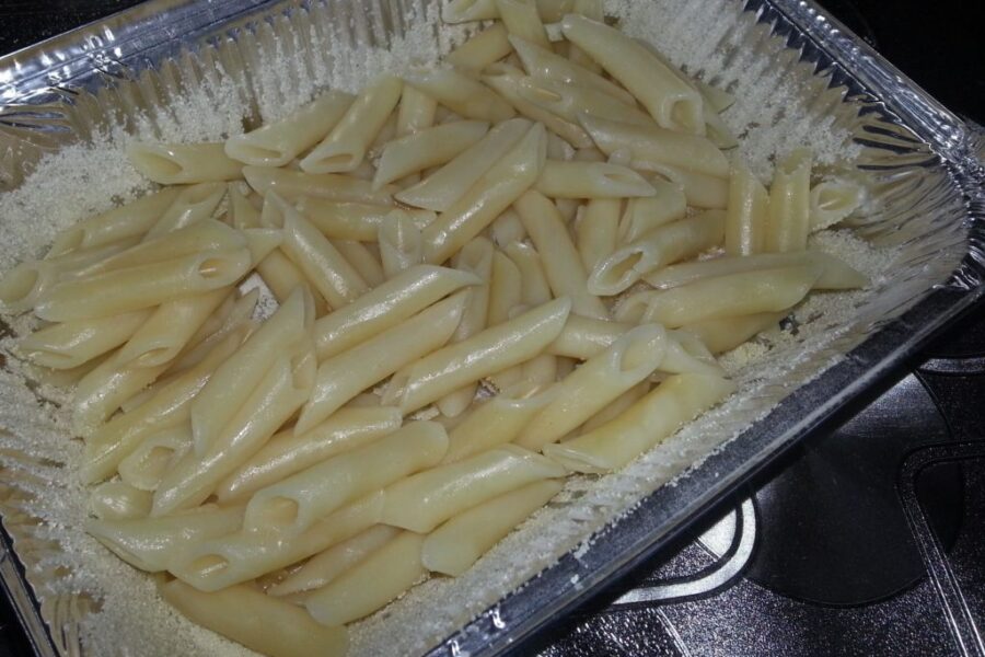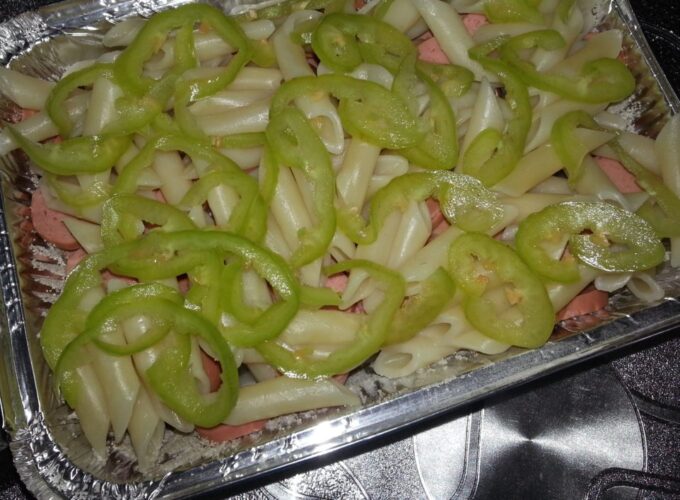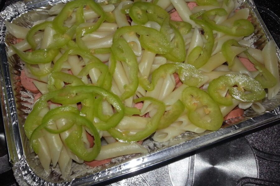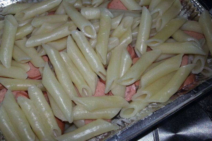 Pentru aceasta reteta am folosit pastele penne, acestea sunt ușor de stratificat. De asemenea, puteți folosi salam în loc de cârnați.