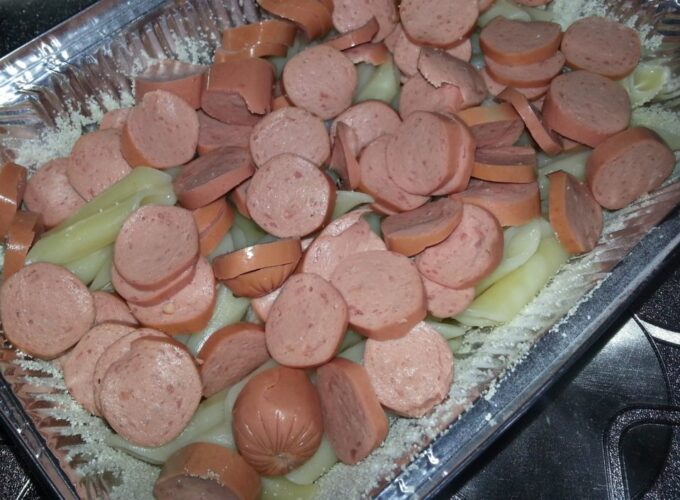 - Tăiați cârnații în cercuri și așezați-i peste paste.