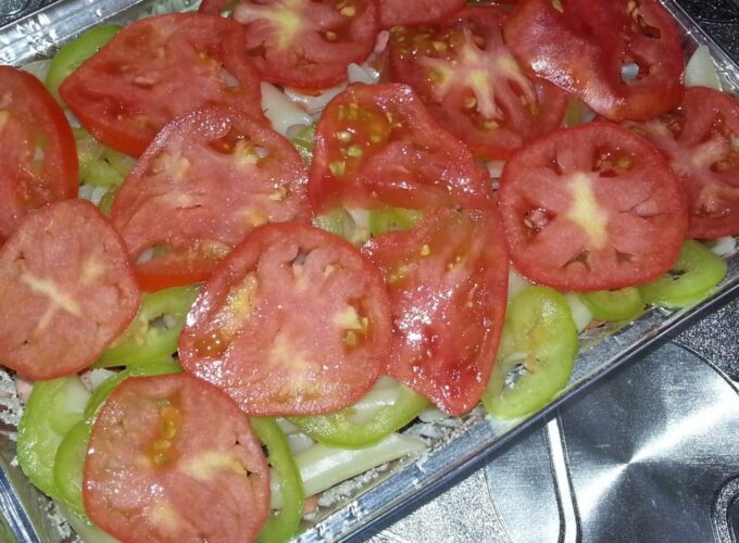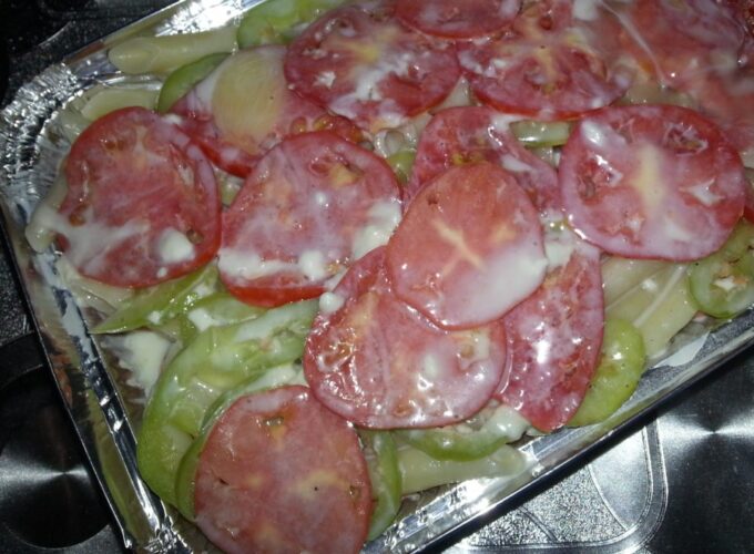 - Se presară totul cu un amestec de ou, smântână și ceapă tocată.