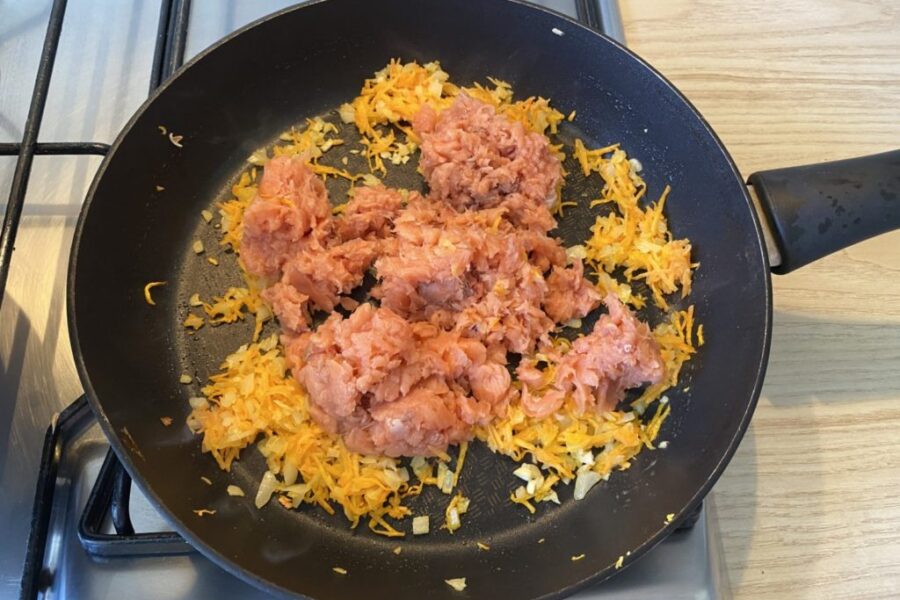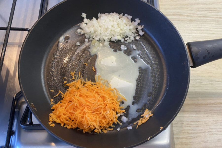 - În paralel (cu gătitul pastelor), începeți să preparați sosul de pește; Într-o tigaie încinsă, aruncați o bucată de unt, ceapa tocată mărunt și morcovii tăiați mărunt. Se prăjește timp de aproximativ trei minute;