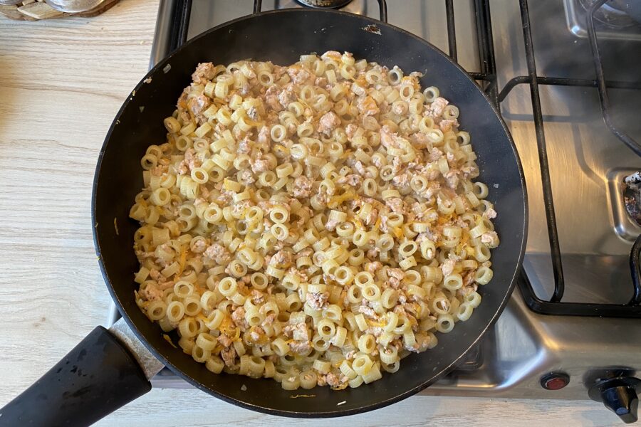 - Prăjiți la foc mediu timp de aproximativ 10 minute (până când pastele sunt fierte);