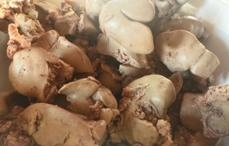 - Se da ficatul de pui crud în apă clocotită și sărată și se pune la fiert, aducând amestecul la fierbere completă, timp de aproximativ 15 minute, amestecând din când în când. Cu 2 minute înainte de finalul fierberii în apă se adaugă 0,5 linguriță de sare și se amestecă. Apoi se scurge apa și se lasă ficatul să se răcească.