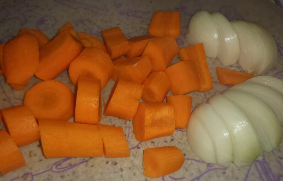 - Se taie în cuburi mari legumele curățate și spălate în prealabil.