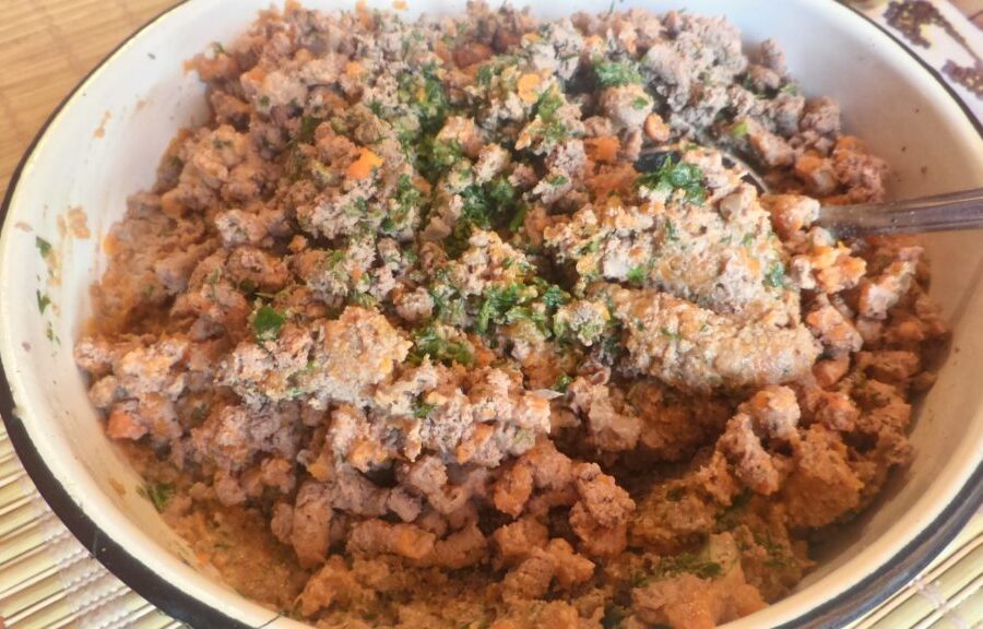 - Se toacă ficatul și legumele printr-o mașină de tocat carne sau un alt robot de bucătărie. Adăugați la acest amestec ierburile tocate, untul, sarea și piperul.