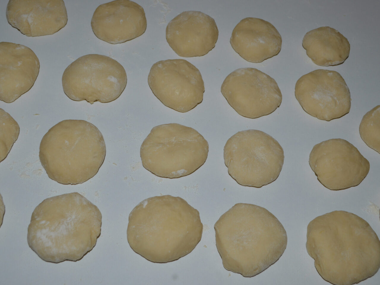 - Apoi formati din fiecare bucata de aluat cite o bila. Acoperiti bilele de aluat cu un prosop, si lasati-le sa mai creasca in volum timp de 10-15 minute.
