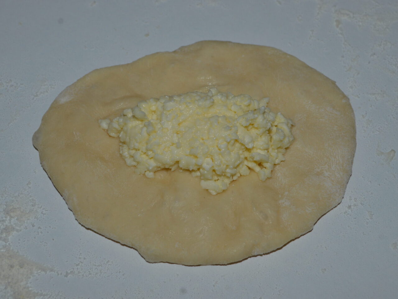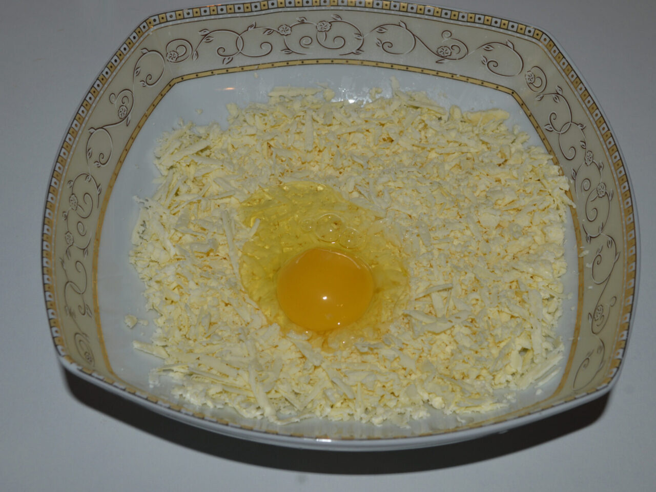 - Intre timp, pregatiti umplutura: radeti pe o razatoare grosiera branza sarata telemea, si adaugati un ou. Amestecati. Daca folositi branza de vaci, atunci adaugati putina sare.