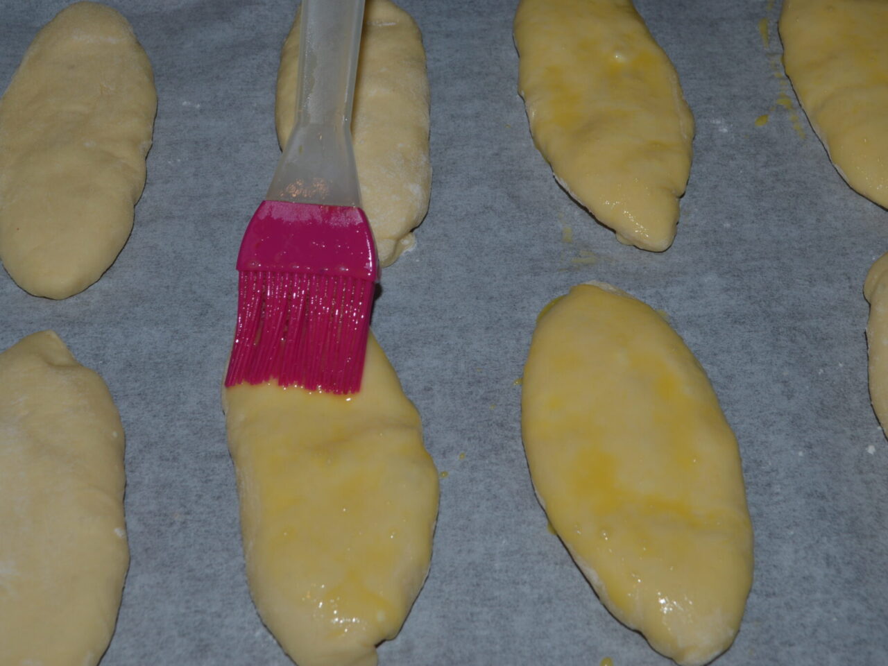 - Intr-o tava asterneti hartie de copt, si transferati pateurile in ea. Bateti un ou si ungeti cu peria de bucatarie pateurile.