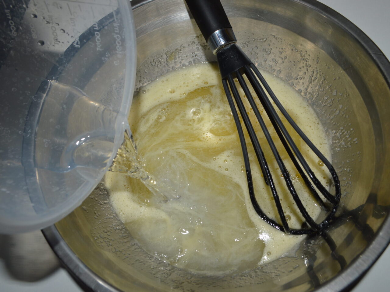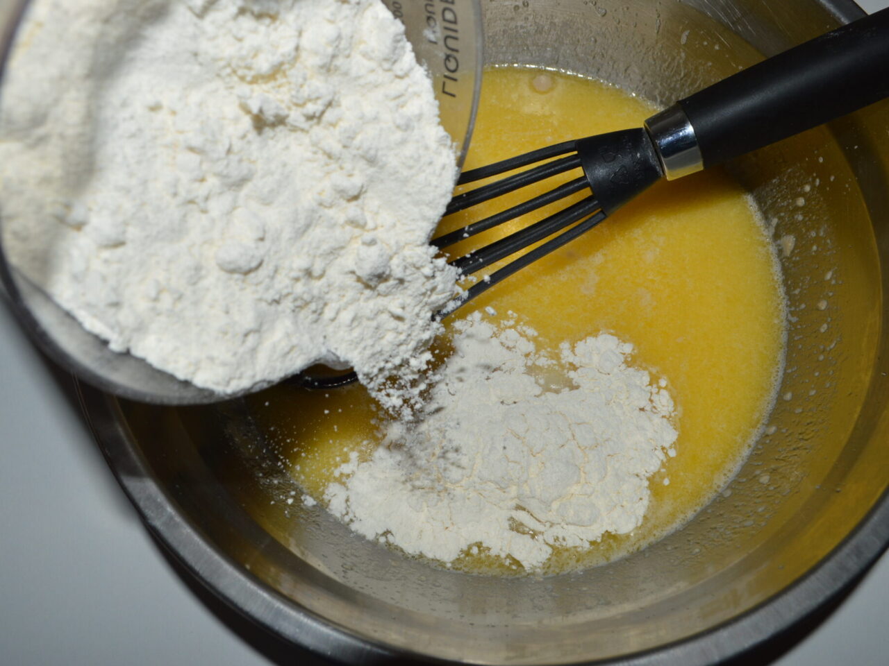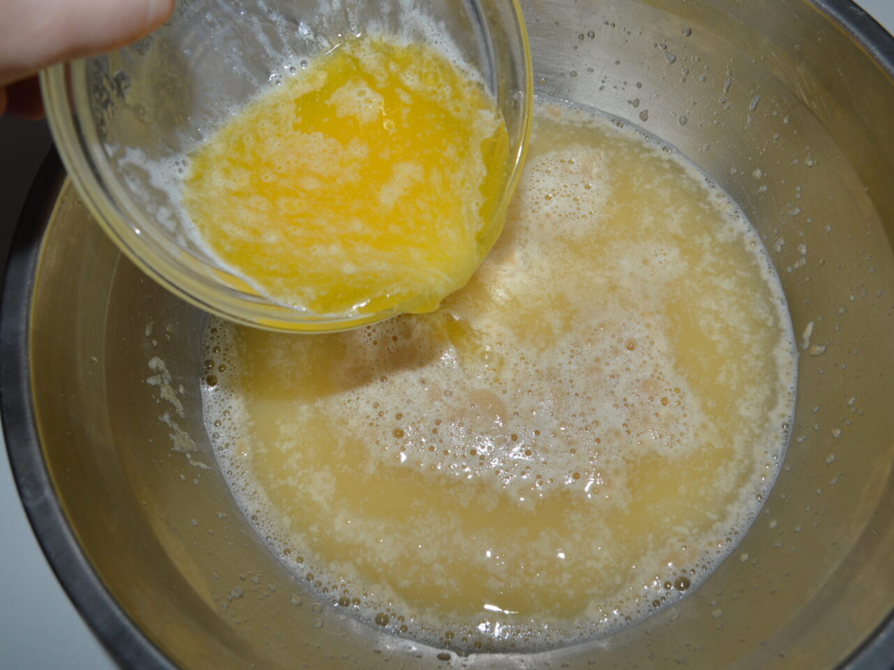 - Dupa ce drojdia a reactionat, adaugati untul topit (puteti sa-l topiti in cuptorul cu microunde sau intr-o cratita).
