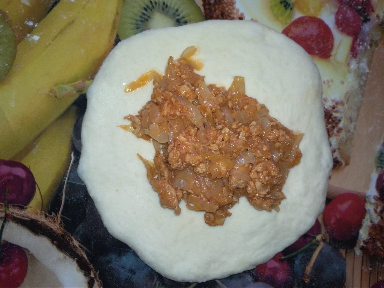 - În timp ce aluatul crește, se prepară umplutura. Sărați și piperați umplutura, apoi prăjiți-o într-o tigaie timp de aproximativ 15 minute.