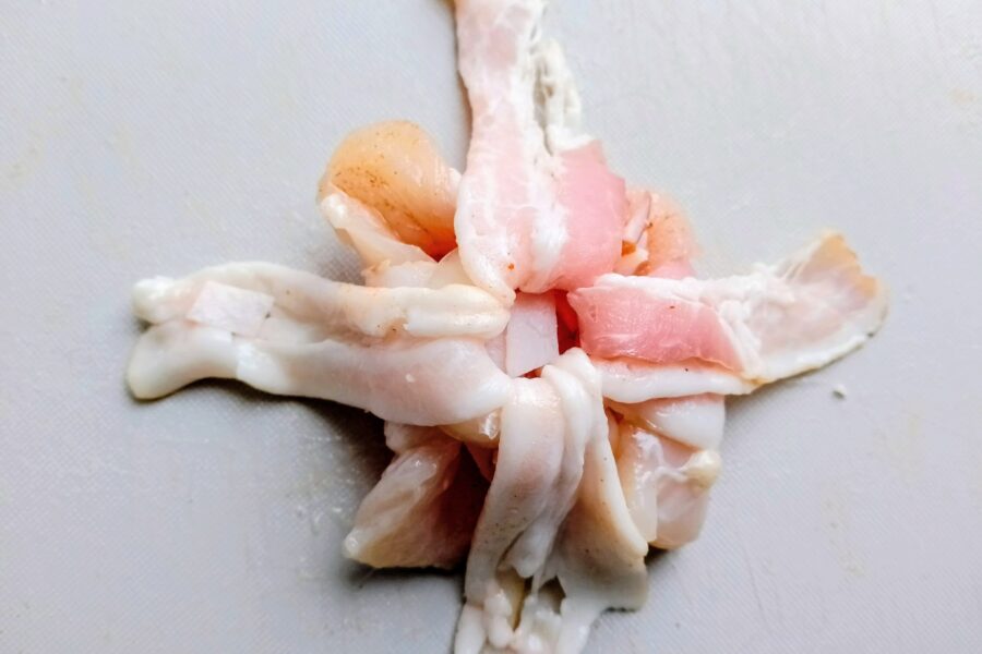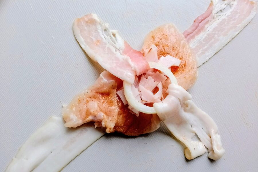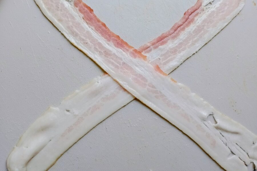 - Asezati doua felii de bacon incrucisate, asa cum se vede in poza.