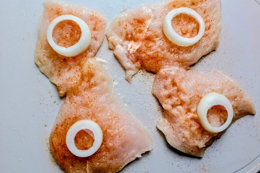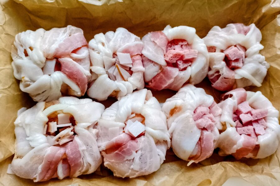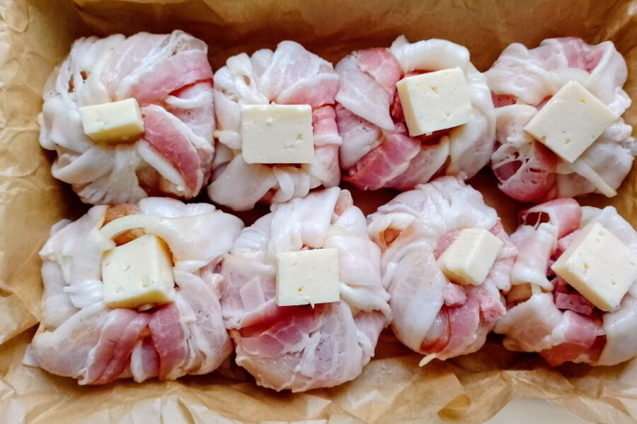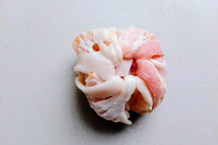 - Toate cele patru bucati de bacon, introduse prin inelul de ceapa, trebuie sa fie invartite sub punga de carne rezultata. Acestea acopera marginile pieptului de pui care au ramas deschise.